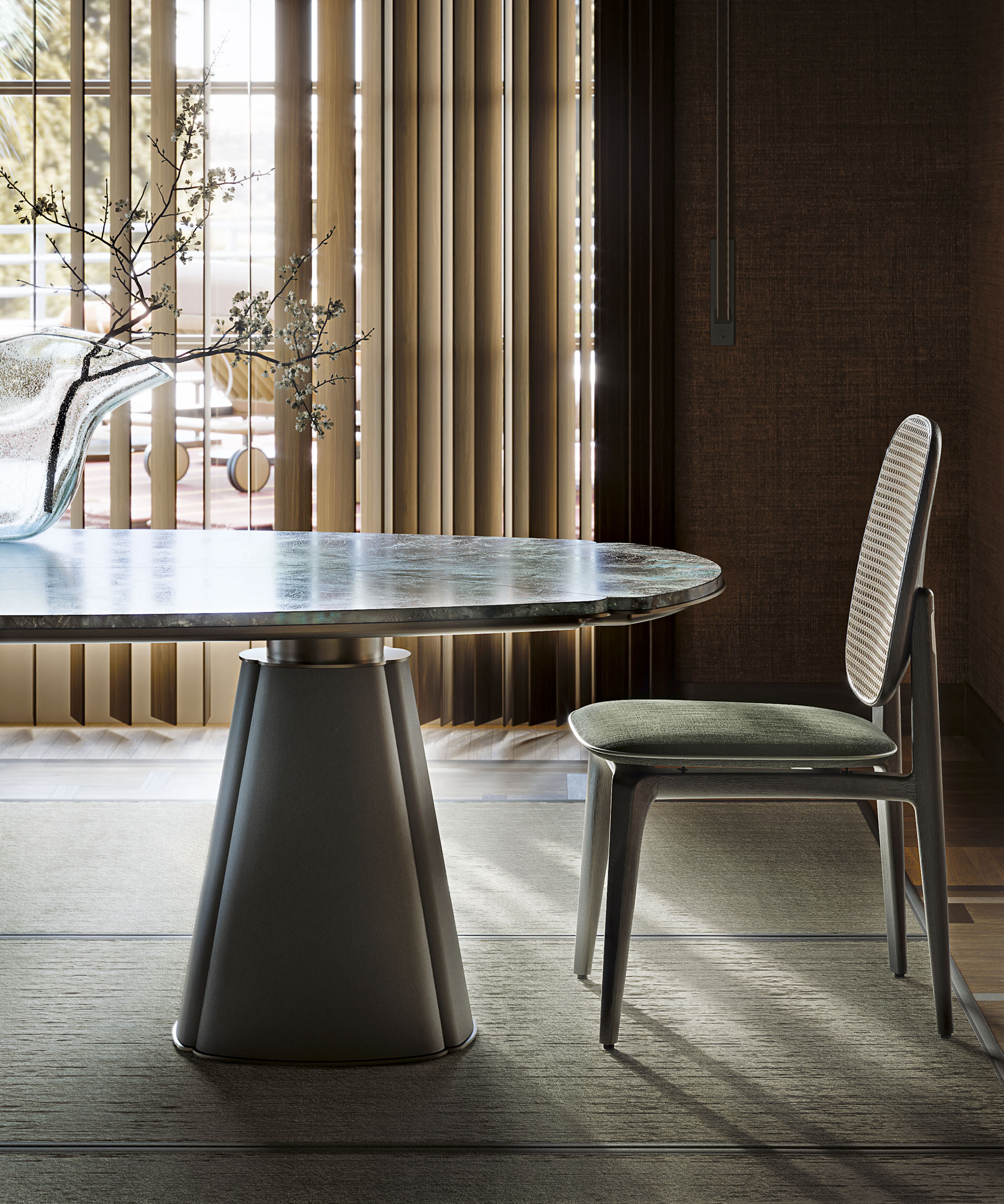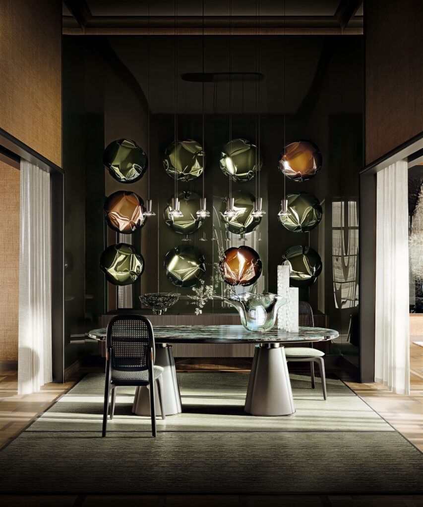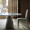 Totalt nyskabende arkitektonisk spisebord fra Giorgetti, Floria Table. Med top i 8 marmorvarianter, base i 26 lædervarianter og selve bordet fås i flere størrelser og højder. Bliver smukt komplimenteret af Giorgetti’s Plume spisebordsstole som fås dels med flet- dels fuldpolstret ryg. Hertil den lysreflekterende vægskulptur Blow som fås i 3 farver.