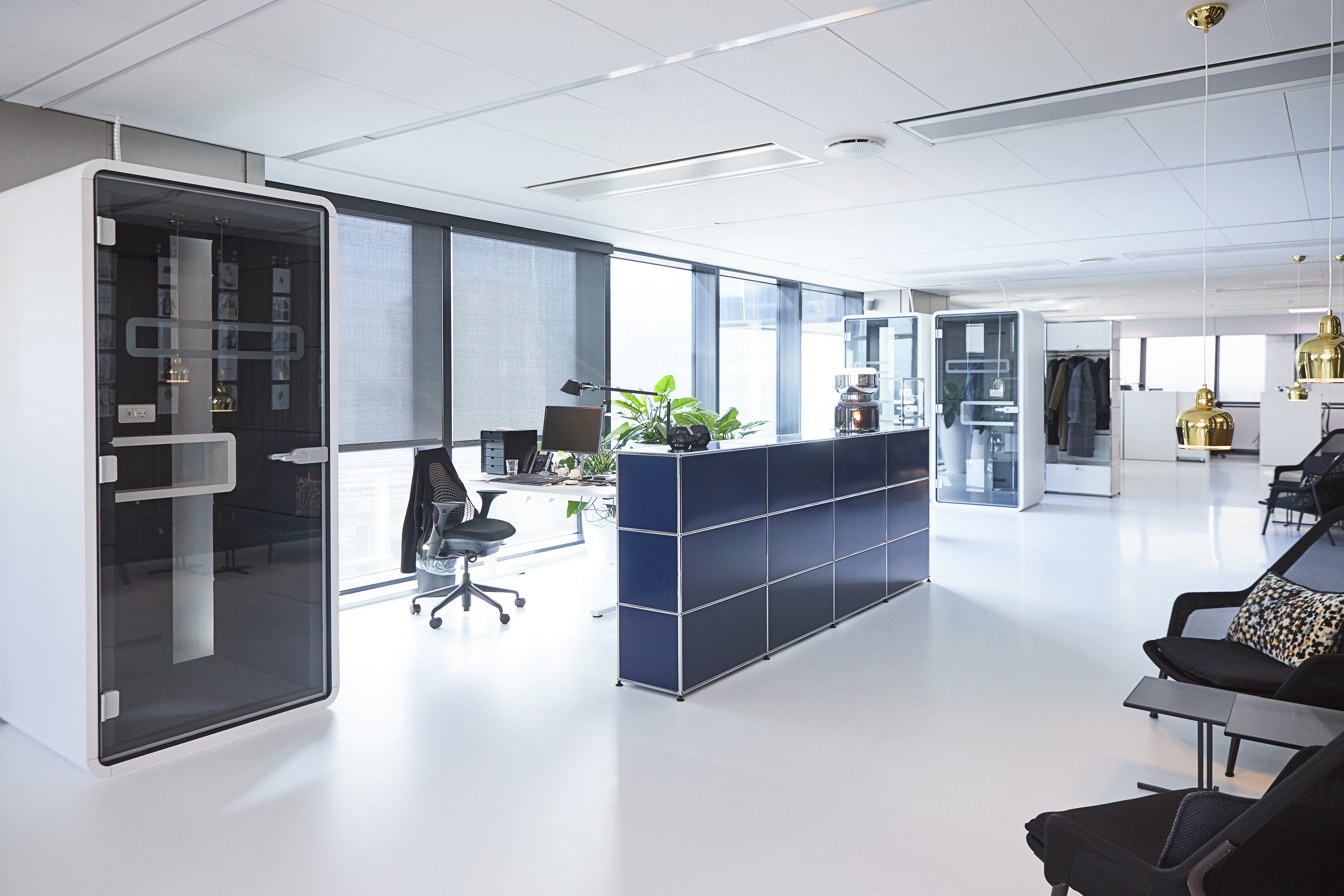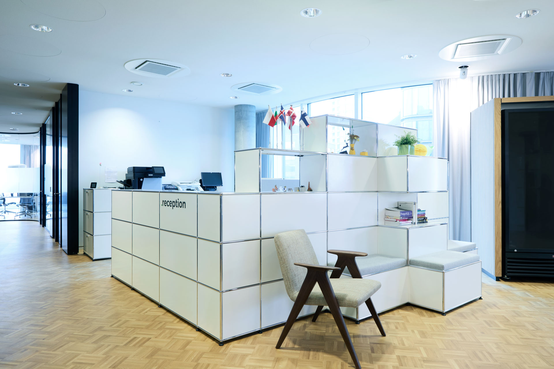 Få INTERSTUDIO Business til at tegne en løsning fra USM Modular Systems, ikonisk design i en slidstærk kvalitet. Så fleksibelt at man altid kan bygge det indkøbte om og også udvide. Findes i flere farver og med forskellige glas- og indbyggede lysmuligheder. USM Modular Systems indeholder muligheden for at planlægge masser af opbevaring ind i receptionsskranken, så både det æstetiske og praktiske går op i en højere enhed.